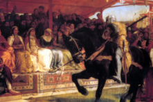 Hậu cảnh phía bên phải là hai người phụ nữ và hai trẻ nhỏ đang xem buổi lễ. Xa xa phía sau là một ngôi đền, có lẽ là Đền Thờ Apollo ở Delphi. Apollo là vị thần của âm nhạc, sự hài hòa và ánh sáng.