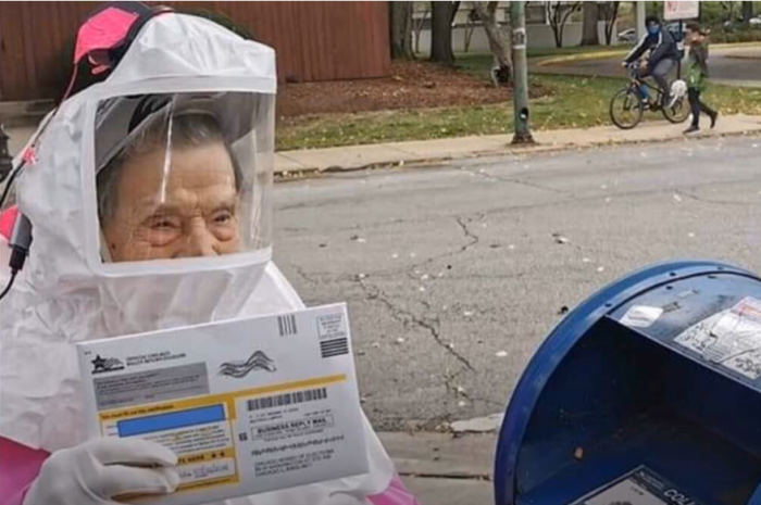 Cụ già 102 tuổi mặc đồ bảo hộ đi bỏ phiếu bầu cử Tổng thống