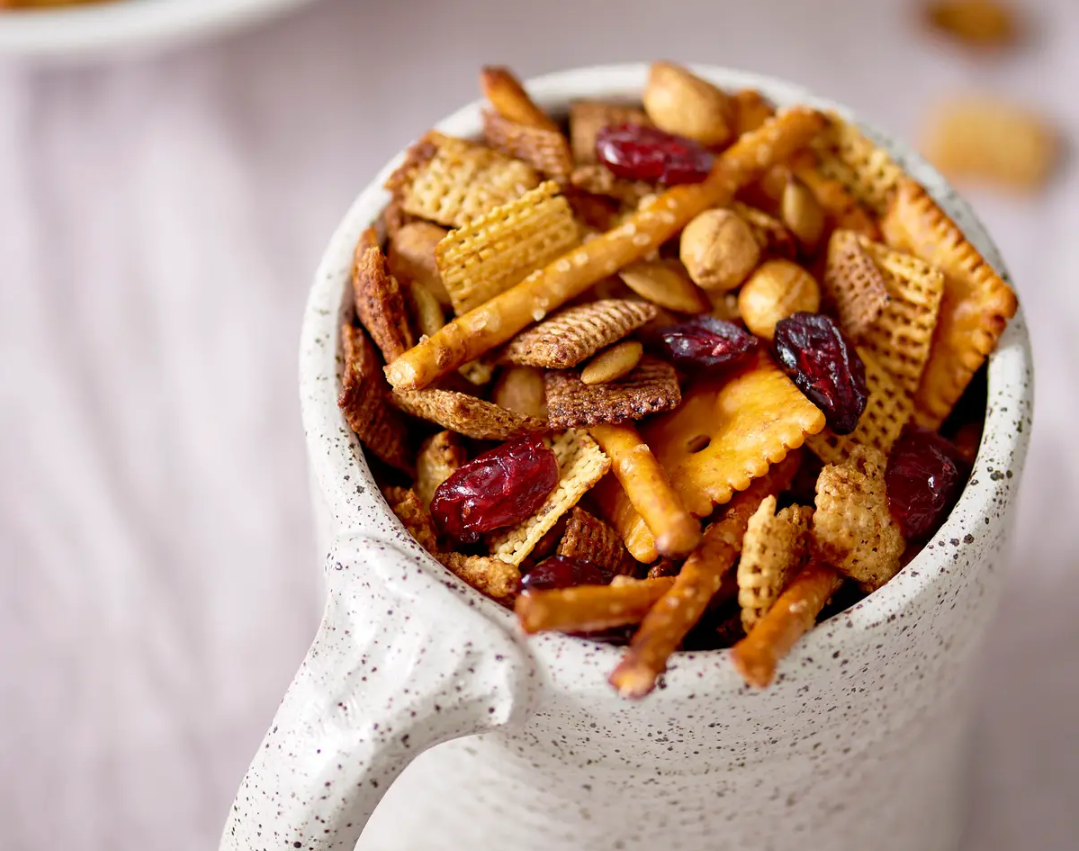 Món bánh snack hỗn hợp Chex Mix làm từ ngũ cốc có vị mằn mặn và giòn rụm, sẽ luôn được mọi người chào đón trong dịp Lễ Tạ Ơn.