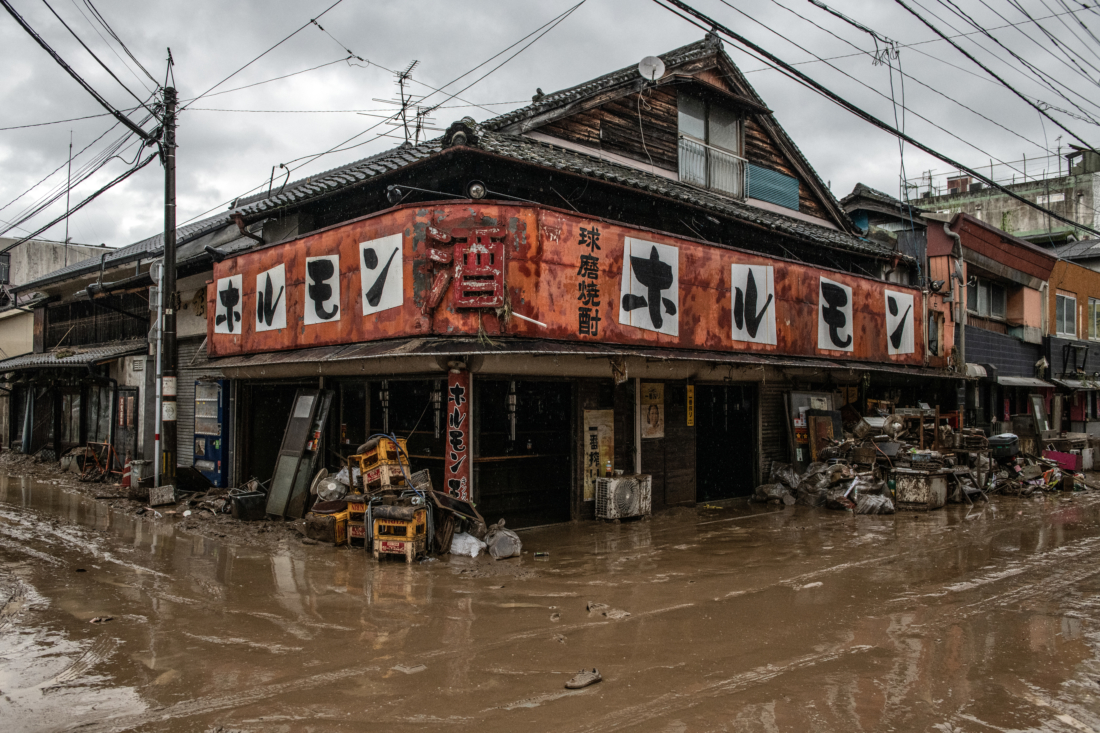 Thùng và tài sản được trục vớt ở bên ngoài một nhà hàng bị lũ lụt sau khi sông Kuma gần đó vỡ bờ, vào ngày 5/7/2020 tại Hitoyoshi, Nhật Bản. (Ảnh của Carl Court…