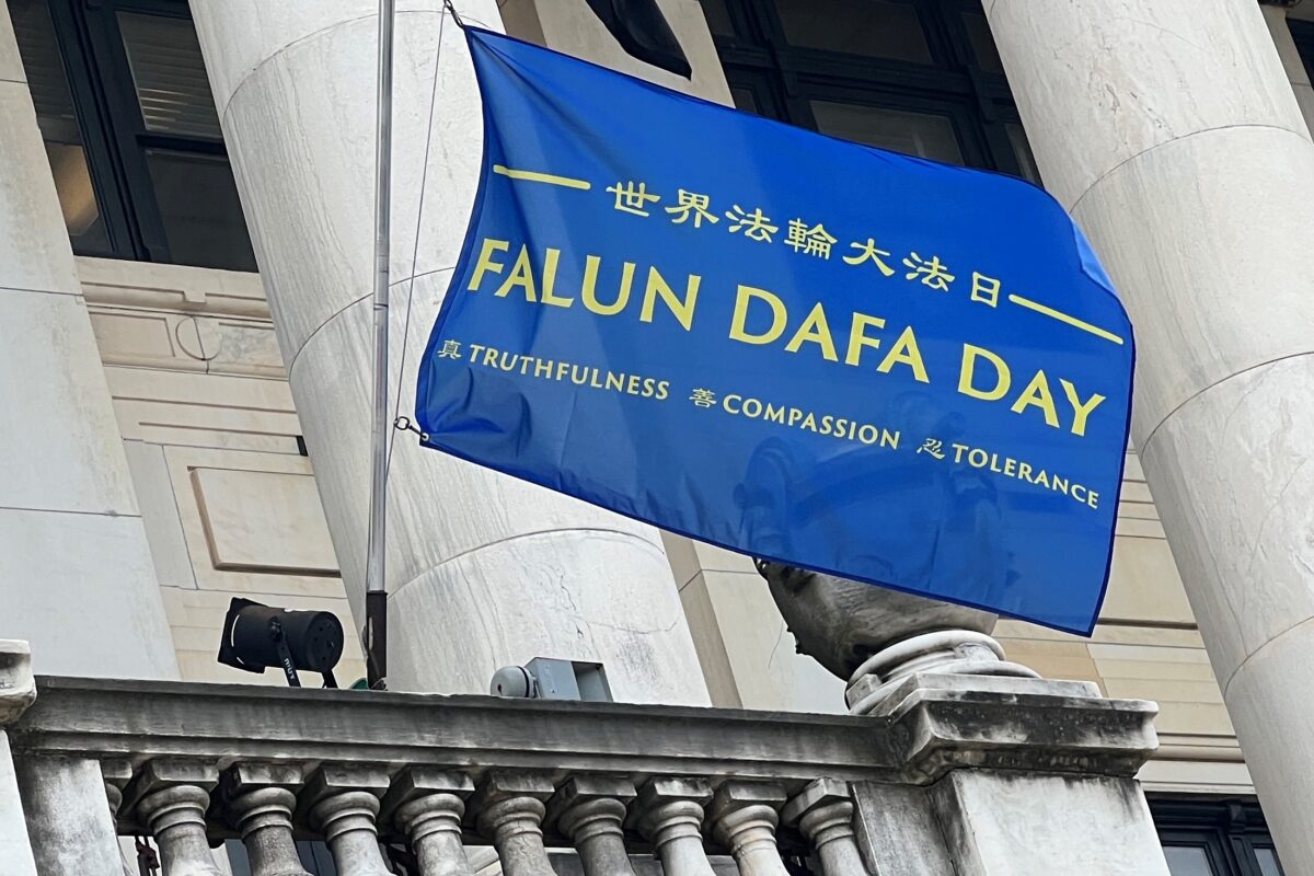 Một lá cờ xanh dương với dòng chữ “Ngày Pháp Luân Đại Pháp” đã được kéo lên tại thành phố thủ phủ Trenton của tiểu bang New Jersey hôm 12/05, để tôn vinh Ngày Pháp…