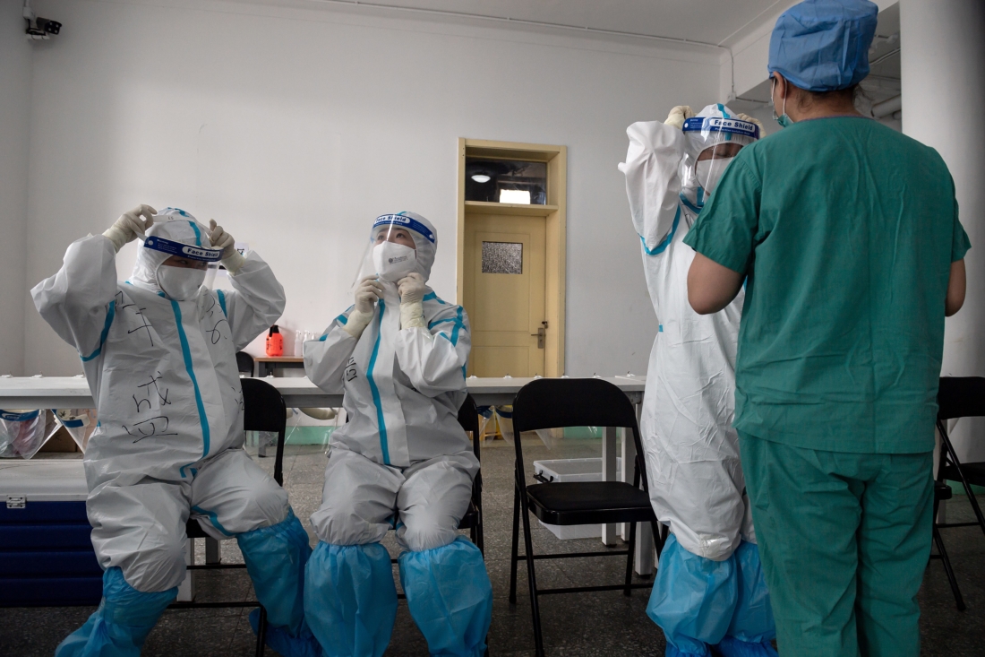 Các bác sĩ từ Bệnh viện chuyên khoa chấn thương và chỉnh hình y học cổ truyền Bắc Kinh chuẩn bị cho ca làm việc của họ tại địa điểm xét nghiệm trên đường Jinrong,…